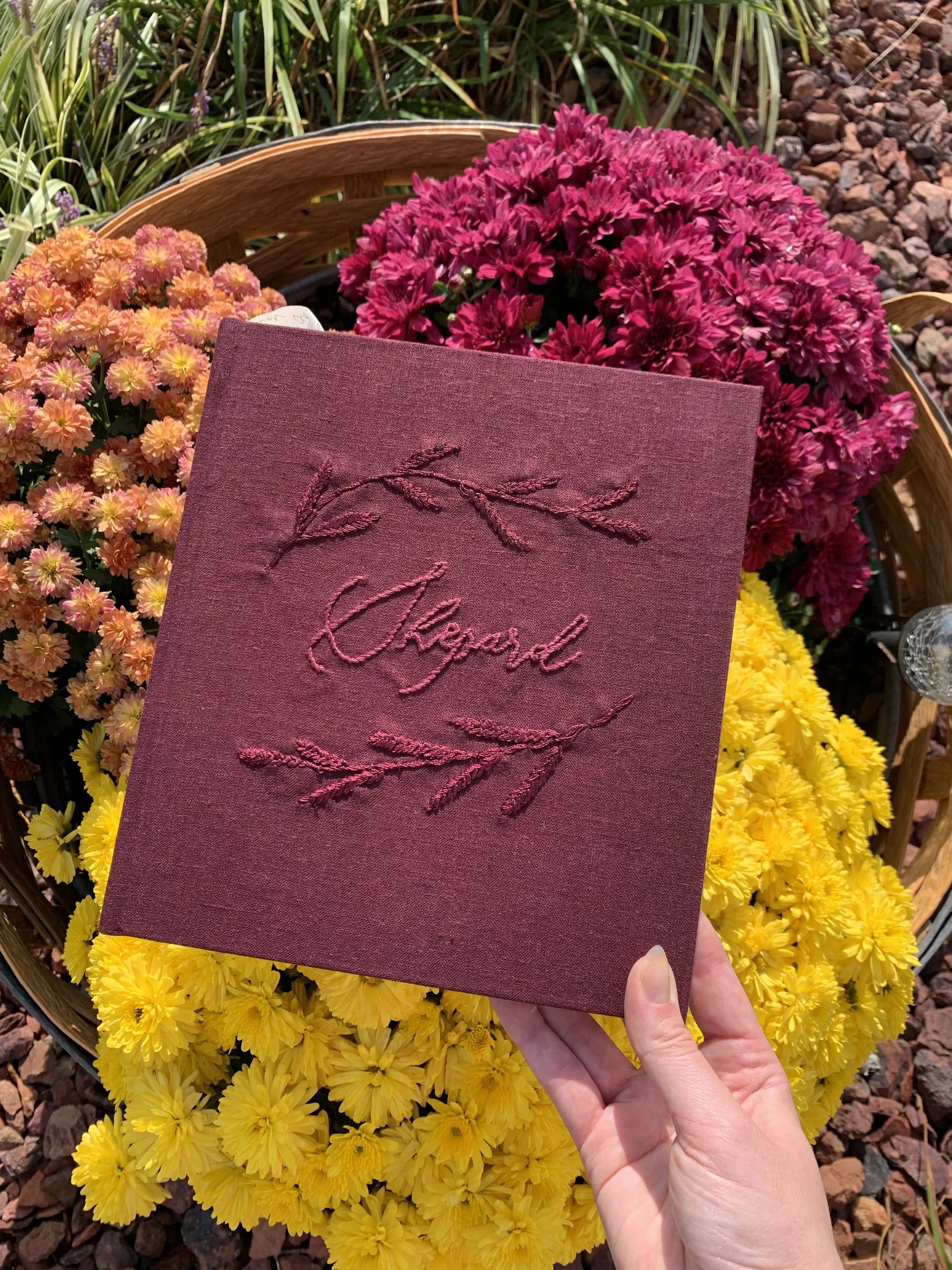 This guestbook included 100 blank journal pages using coptic stitch binding. The cover includes hand-stitched embroidery, stitches used are chain and basic stitch.